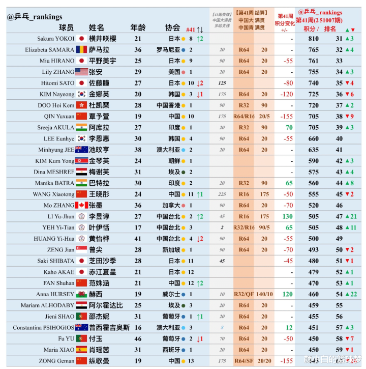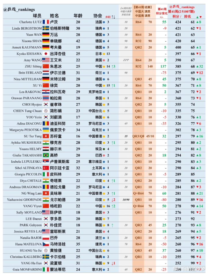 朱雨玲(去年没打)今年+225升至第六,张本美和下跌到第七;申裕斌进入四强+570升至世界排名第13,早田希娜与长崎美柚分别下滑一个排名。钱天一升至第18,朱芊曦升至第24。(大藤沙月、伊藤美诚、桥本帆乃香的排名没有任何变动)