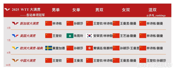 WTT北京大满贯女单决赛,王曼昱4-2击败孙颖莎夺冠,王曼昱获得2000积分,孙颖莎获得1400积分,陈幸同与申裕斌分别获得700积分,随着北京大满贯的谢幕,2025年的大满贯赛事也全部结束,2000积分的赛事完结。